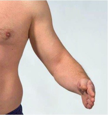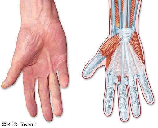 etter seneskade, dropphånd, svergehånd, klohånd eller brudd)
