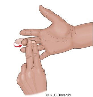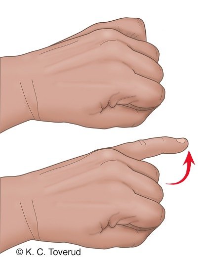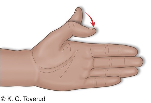 Vurder styrke i tommel ekstensjon, fleksjon og abduksjon. Vurder styrke i lillefinger