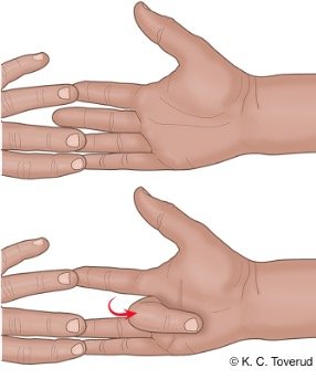 - Beveger metacarpen mot leddflaten og registrerer smerte, krepitasjon og palperer etter hydrops