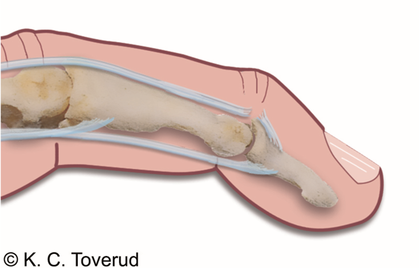 - Operasjon ved avulsjonsfraktur, forøvrig ortose i 8 uker med hyperekstensjon i DIP