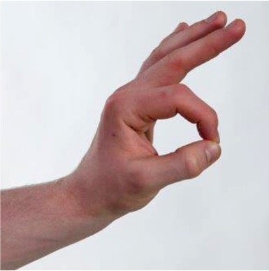 i opposisjongrep. Vurder styrken i fingersprik (abduksjon) og fingersamling (adduksjon).