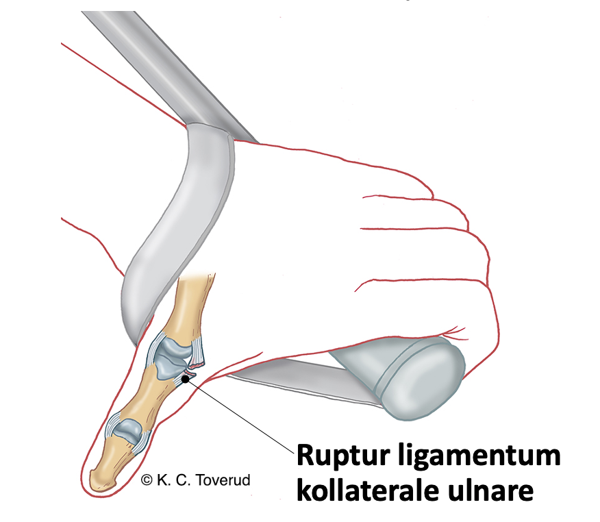 - Når pasienten så forsøker å rette ut fingeren igjen, kiler fortykkelsen seg fast i åpningen til seneskjeden.