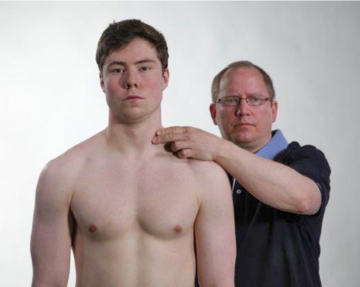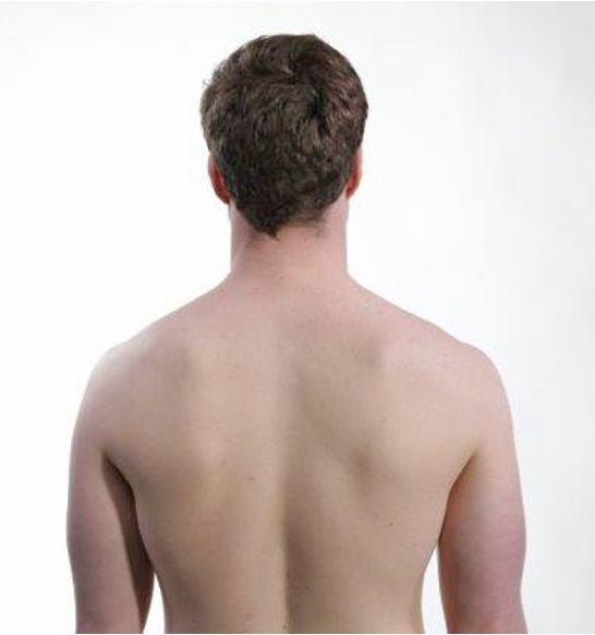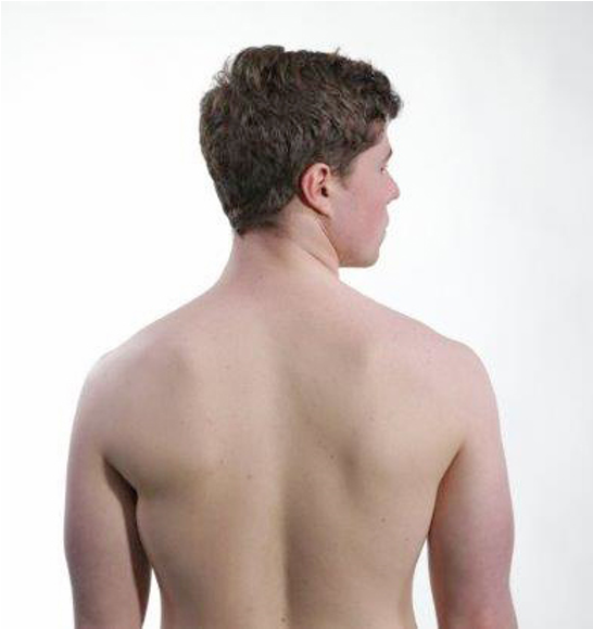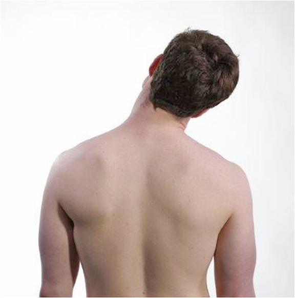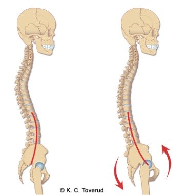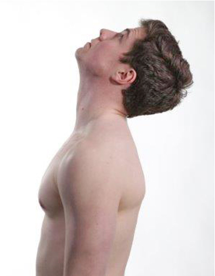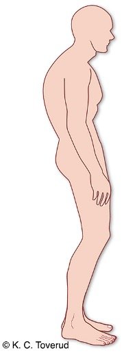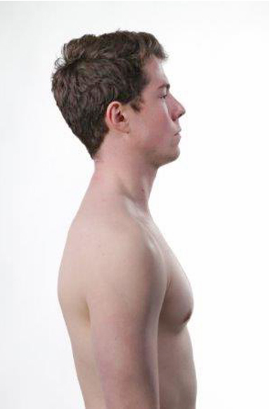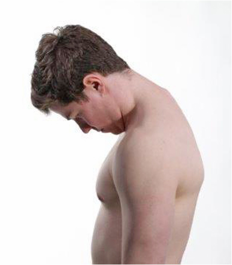 Sett fra siden vil denne kroppsholdningen preges av økt thorakal kyfose, anterior stilling av skulderbuen, protraherte skuldre (skuldre frem og opp), økt fleksjon av den cervicothorakale overgangen, utrettet cervikal lordose og økt ekstensjon av occiput på atlas.Hodets tyngdepunkt forskyves da fremover, som igjen medfører at nakkemusklene, spesielt suboccipitalmuskulaturen, må jobbe med konstant spenning (E H Julsvoll (red,) Temporomandibulær dysfunksjon. Teori, undersøkelse, behandling. Cappelen Damm Akademisk 2018).