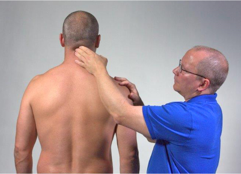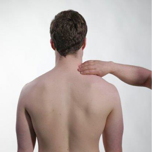 Palpasjon av mm. suboccipitalis (nakkerosetten), m. trapezius, m. levator scapulae og m. sternocleidomastoideus på begge sider. Noter om triggerpunkter i muskulaturen og noter om du utløser strålesmerter til henholdsvis hodet eller ut i armen.