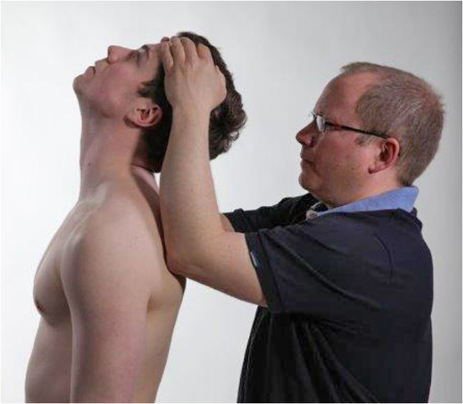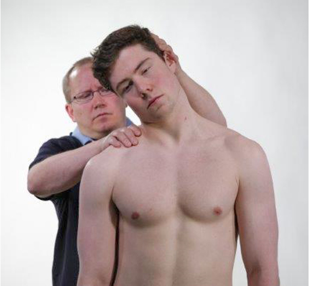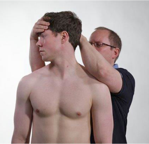 - Sidefleksjon: Øret ned mot skulder. Pass på at pasienten ikke løfter skulder
